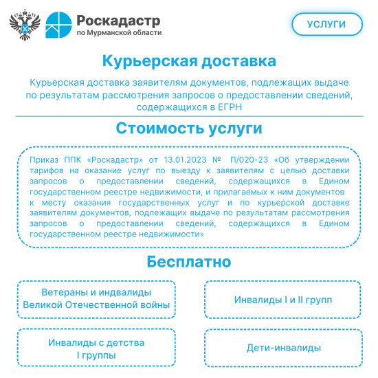Роскадастр по Мурманской области предлагает выездной прием запросов на предоставление сведений из Единого государственного реестра недвижимости (ЕГРН), а также доставку готовых документов курьером.