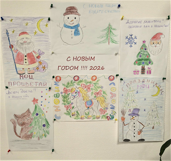 В своих картинах юные художники отразили новогоднее настроение и добрые поздравления МФЦ. Рисунки создают праздничную атмосферу для посетителей многофункционального центра.